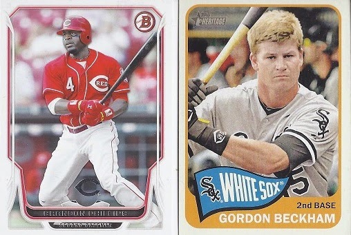 You really don't see too many bunting cards among the Bowman prospects. So, they easily win this one. Heritage 8. Bowman 6.